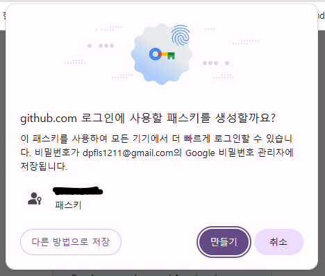 이렇게 따로 뜨고 add passkey를 누르면 구글 계정에 저장할 수 있는게 뜨더라고요 저는 여기에 만들기를 해줬어요