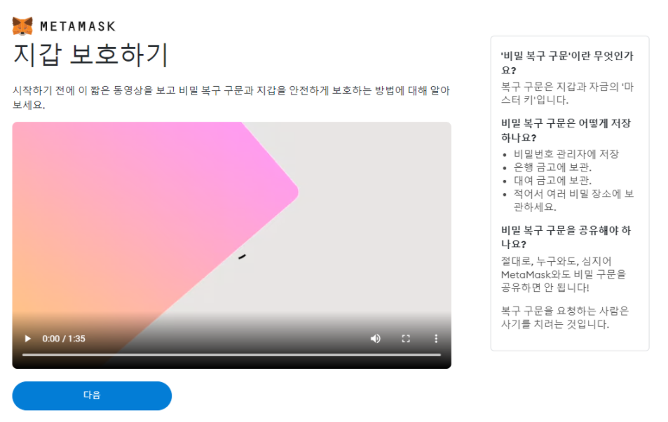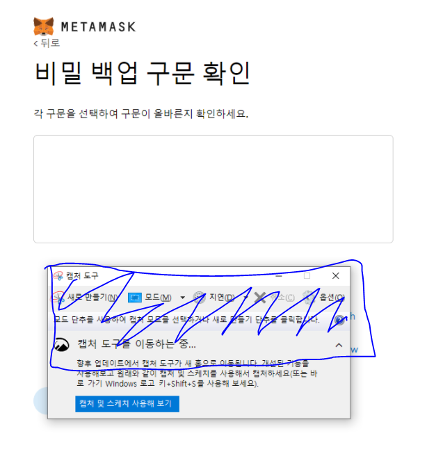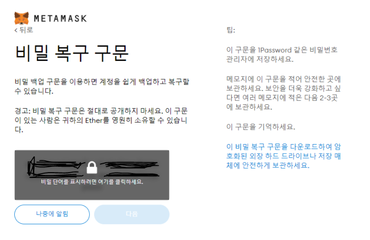 이제 중요한 부분이다~~!! 복구 구문이다. 이는 내 계정임을 알리는 하나의 아이디라 생각하면 된다. 구문은 순서대로 영단어가 12개 있는데, 꼭 순서대로 노트에 적어두길 바란다. 노트에 적어두는 이유는 컴퓨터나, 카톡에 메모돼있는 건 해킹의 우려가 있어 노트에 대소문자 구별해서 적어두길 바란다. 그다음 오른쪽 파란 상자에 아까의 단어가 무작위로 배치되어있는데, 보안상 가렸다. 그 단어를 순서대로 클릭하면 된다.