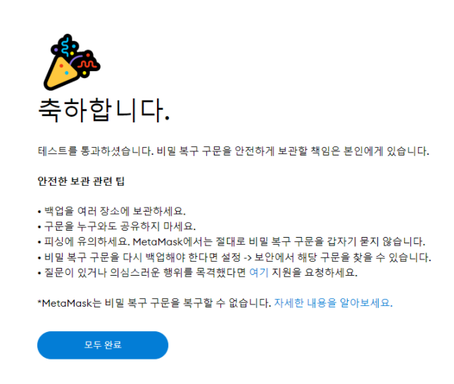 새 가상 지갑이 생성되었으며, 꼭 복구 구문은 노트에 잘 적어두길 바란다. 비번도 까먹지 않게 같이 적어두면 좋다.