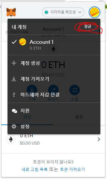 이렇게 생성되었으며, 파란색으로 동그라미 친 것이 계좌번호라 생각하면 된다. 가상화폐 이동할 때 저 주소를 사용하면 된다. 쓰고 나면 빨간 동그라미. 잠금. 로그아웃을 해주므로 도난의 위험성을 방지한다.