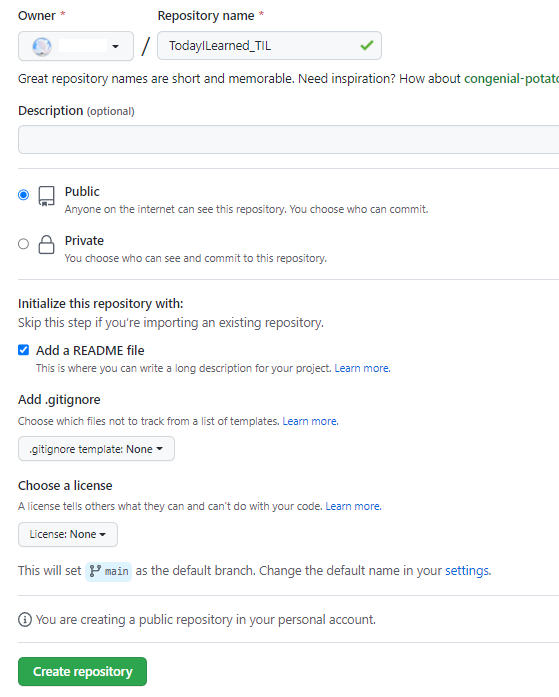Public! 으로 해야한다는 점과 ReadMe를 꼭 추가해주세요 저같은 경우엔 안하면 안되더라고요.. ㅠㅠ