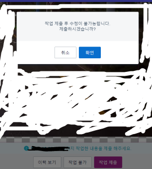 아래 작업 제출을 누르면 위와 같이 뜨며, 확인까지 하고 나서 제출이 완료가 된다.