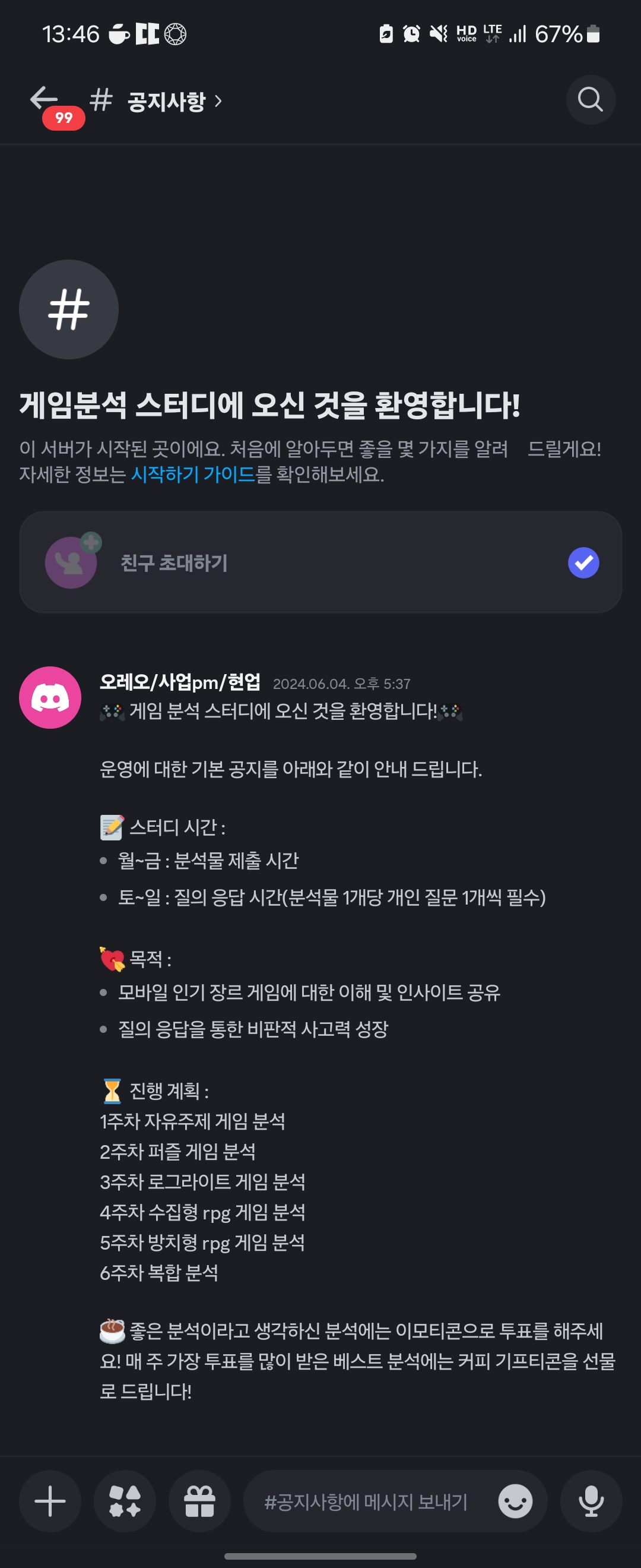 이번에 진행한 스터디는 온라인으로 이루어져 따로 회의는 없었습니다. 일주일에서 평일인 월-금 동안 해당 주차의 주제에 맞는 게임을 골라 분석하고 디스코드 채널에 공유하면 주말 동안 서로의 분석서를 읽고 질의응답하면 됩니다.
