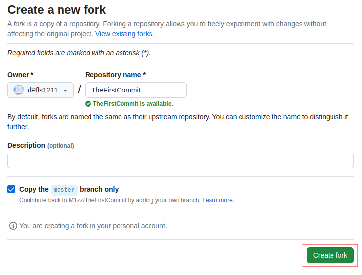 클릭하면 오른쪽 이미지 처럼 Create a new fork페이지가 등장하는데,