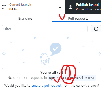 2 ) Branches오른쪽에 Pull reauets를 누르면 create a pull request를 클릭할 수 있다.