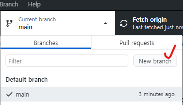 new Branch를 눌러 가지이름을 만들고 publish branch를 하여 가지를 추가한다.
