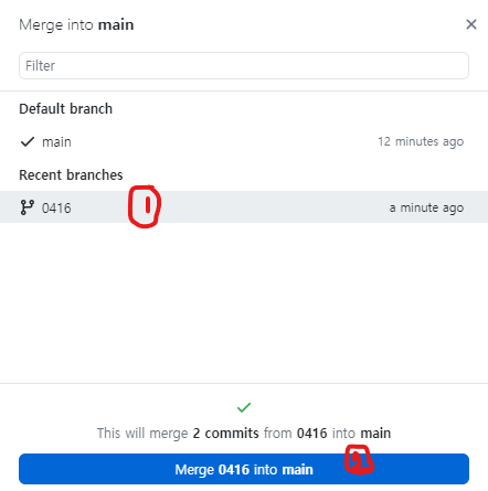 합쳐졌으면 하는 가지 (1)를 클릭하고 'Merge (1) into main'(2)을 클릭하여 머지해준다.