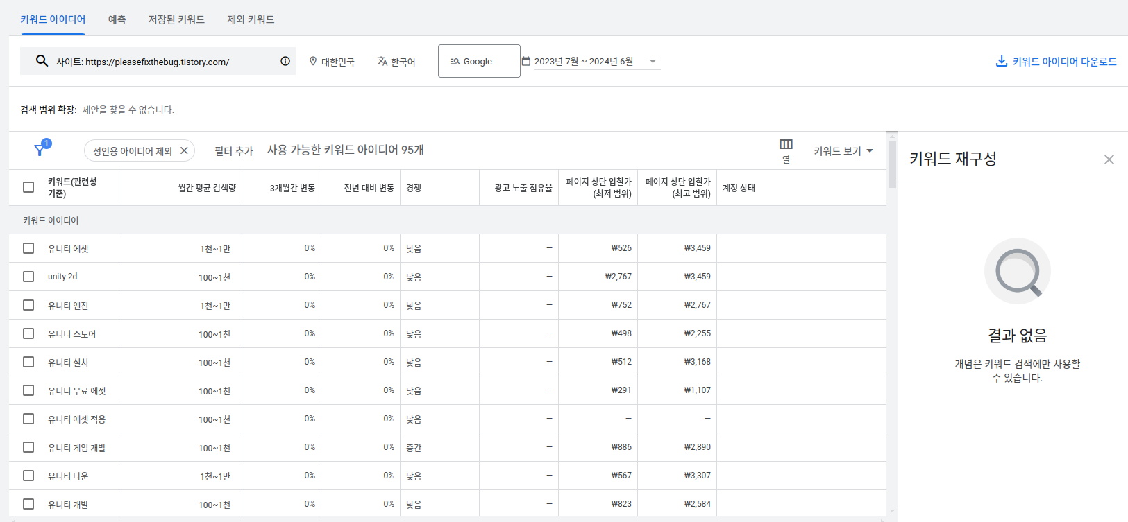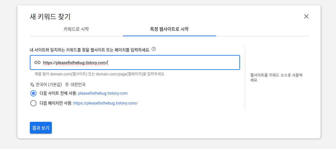 새 키워드 찾기 - 특정 웹사이트로 시작 에서 제 블로그 주소를 넣어줬습니다