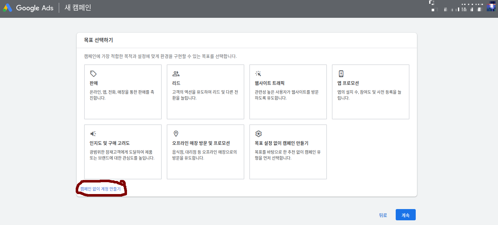 이렇게 뜨는데 마찬가지로 캠페인 없이 계정 만들기를 클릭해줍니다
