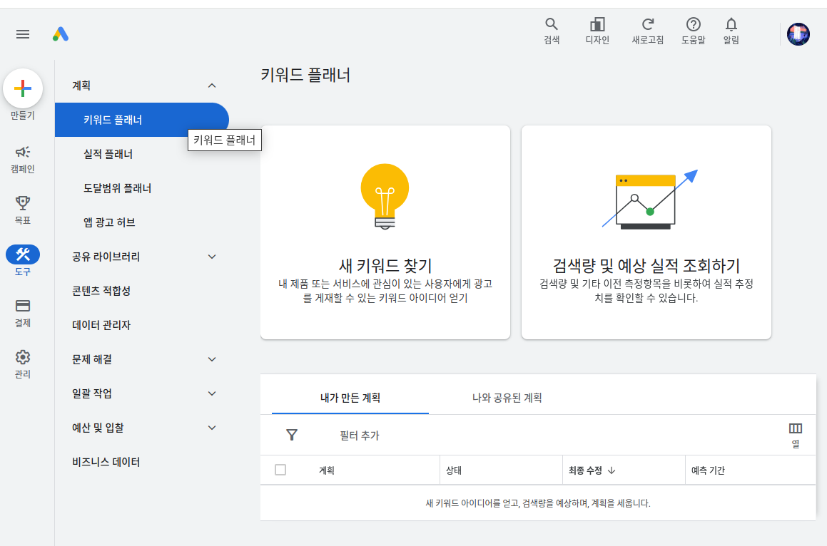 왼쪽 상단의 햄버거 버튼 ㅡ3개짜리 클릭하고 - 도구 - 키워드 플래너