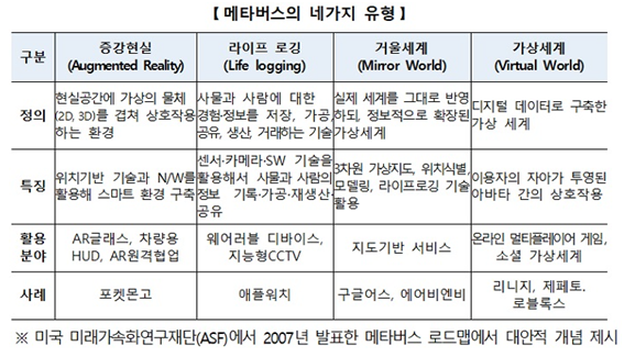 "증강현실, 라이프 로깅, 거울세계, 가상세계 등 4가지 유형으로 구분했다"라고 합니다.
