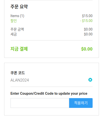 입력을 완료하면 위처럼 사용한 쿠폰 번호가 뜨고, 금액은 $0,00으로 무료로 된것을 발견할 수 있습니다!!